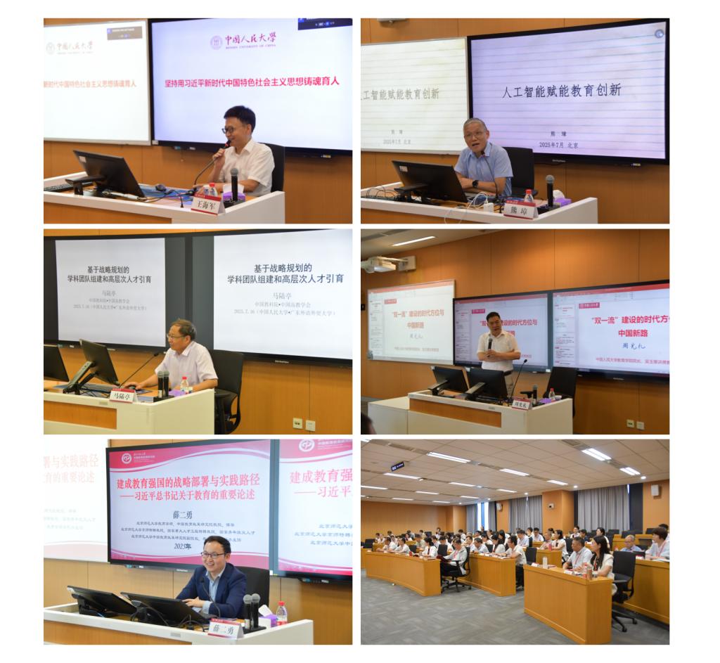 在專題授課中,中國人民大學中共黨史黨建學院教授王海軍以“堅持用習近平新時代中國特色社會主義思想鑄魂育人”為題,闡釋黨的創新理論對高等教育的指導意義;對外經濟貿易大學信息學院院長、北京航空航天大學教授熊璋講授人工智能賦能教育創新,探討科技賦能教育現代化的路徑;中國教育科學研究院研究員馬陸亭解析基于戰略規劃的學科團隊組建與高層次人才引育,提供學科建設方法論;中國人民大學教育學院院長、黨委副書記周光禮分享人大“雙一流”建設的探索路徑與實踐經驗,為學校改革發展提供對標藍圖;北京師范大學京師特聘教授薛二勇深度解讀建成教育強國的戰略部署與實踐路徑——習近平總書記關于教育的重要論述,系統闡釋了教育強國建設的頂層設計邏輯、階段性任務及推進舉措。