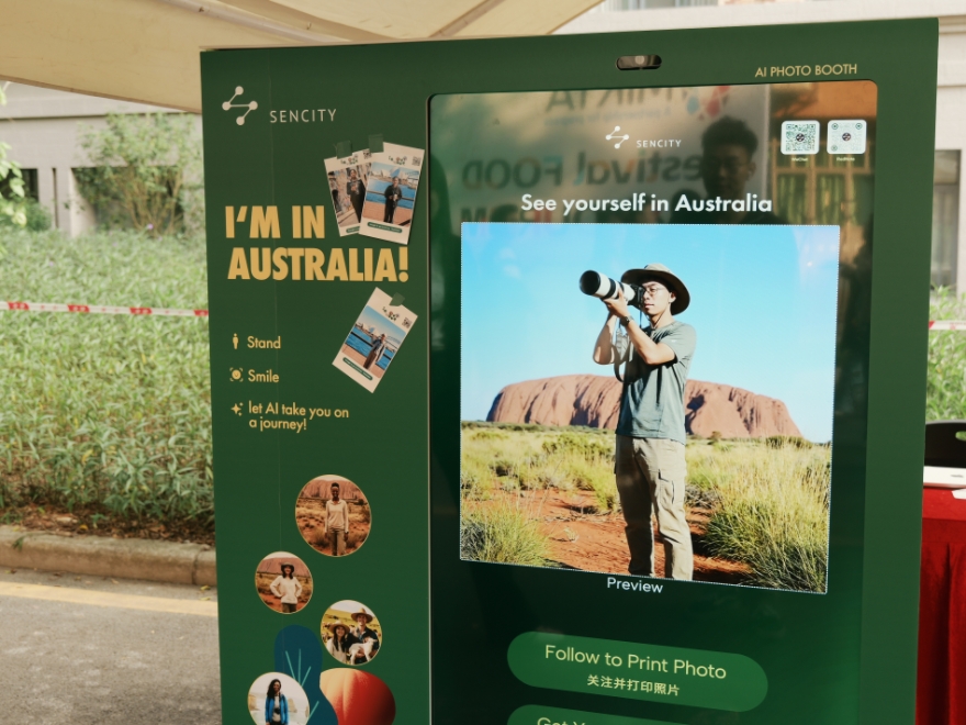 澳大利亞攤位則以甜品與點心俘獲游客芳心,以司康為基底的萊明頓蛋糕淋上甜奶油與果醬,外酥里嫩的牛肉派香而不膩,如云朵般輕盈的帕夫洛娃甜點入口即化。值得一提的是,澳大利亞展區設置的AI互動區成為現場焦點。參與者可以在大屏前即時生成與澳大利亞地標景觀的“合影”,搭配澳洲民謠的現場演奏,吸引眾多師生排隊體驗。